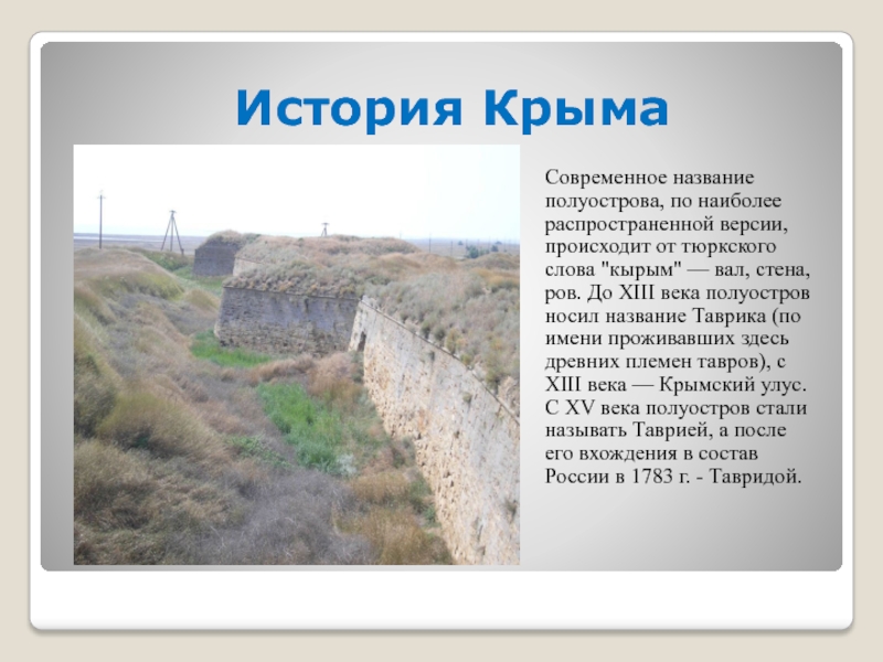 тюркского слова "кырым" — вал, стена, ров. До XIII века полуостров носил название Таврика (по имени проживавших здесь древних племен тавров), с XIII века — Крымский улус. С XV века полуостров стали называть Таврией, а после его вхождения в состав России в 1783 г. - Тавридой.