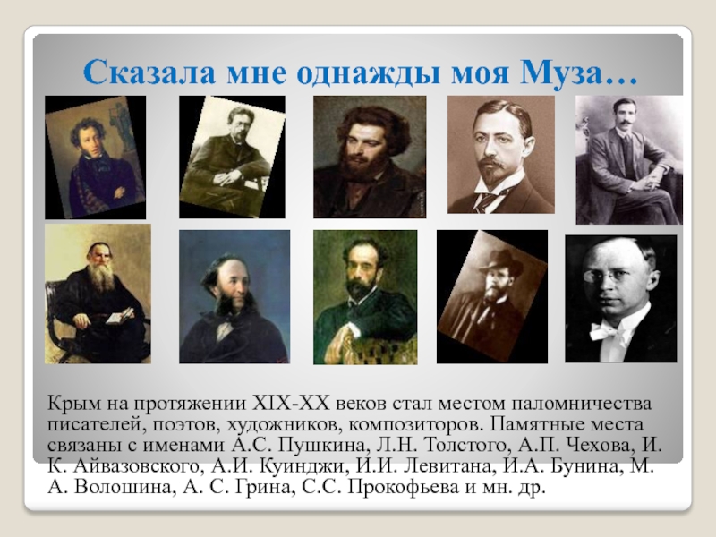 местом паломничества писателей, поэтов, художников, композиторов. Памятные места связаны с именами А.С. Пушкина, Л.Н. Толстого, А.П. Чехова, И.К. Айвазовского, А.И. Куинджи, И.И. Левитана, И.А. Бунина, М. А. Волошина, А. С. Грина, С.С. Прокофьева и мн. др.