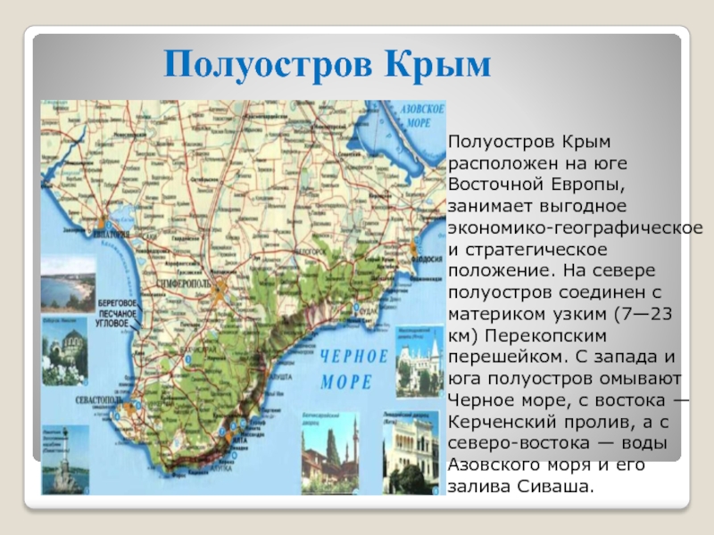 экономико-географическое и стратегическое положение. На севере полуостров соединен с материком узким (7—23 км) Перекопским перешейком. С запада и юга полуостров омывают Черное море, с востока — Керченский пролив, а с северо-востока — воды Азовского моря и его залива Сиваша.