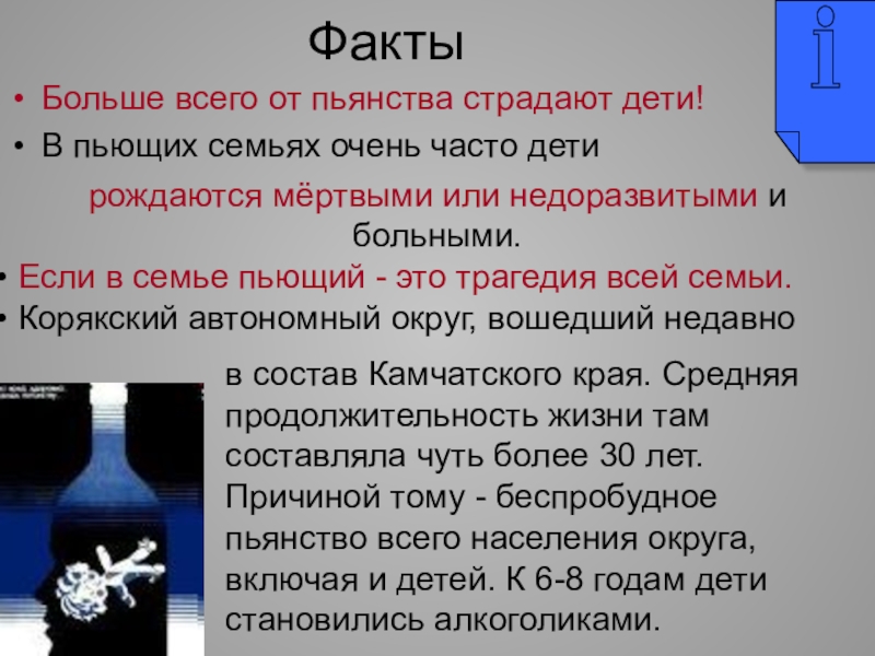 в состав Камчатского края. Средняя продолжительность жизни там составляла чуть более 30 лет. Причиной тому - беспробудное пьянство всего населения округа, включая и детей. К 6-8 годам дети становились алкоголиками.