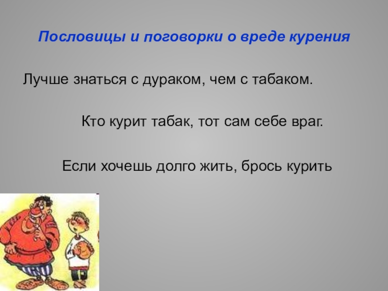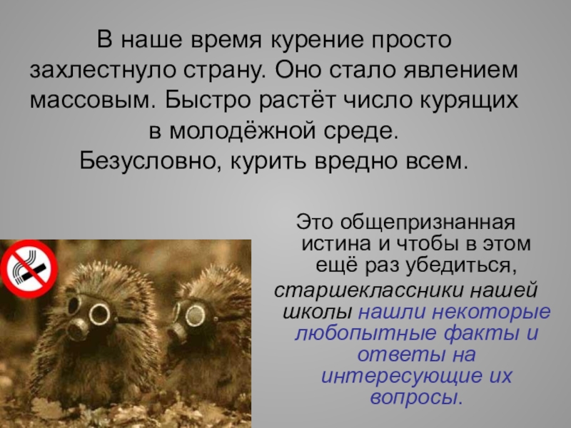 В наше время курение просто захлестнуло страну. Оно стало явлением массовым. Быстро растёт число курящих в молодёжной среде.