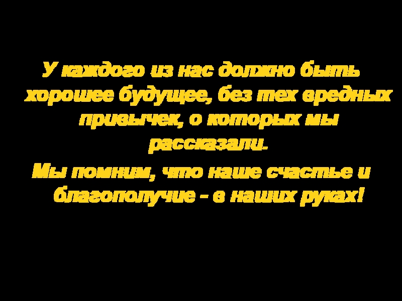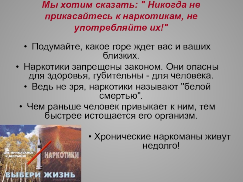 Мы хотим сказать: " Никогда не прикасайтесь к наркотикам, не употребляйте их!"