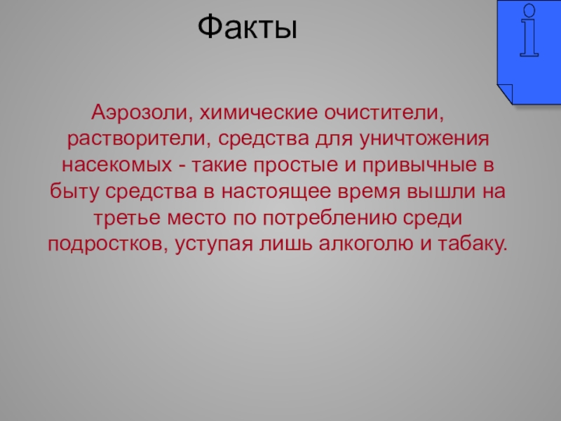 издалека. Ощущение потрясающее, но оно быстро проходит: «кайф» длится не больше 20 секунд, после чего надо вдохнуть новую порцию. Я не могла остановиться, хотелось ещё и ещё. В тот вечер мы прикончили четыре флакона очистителя».