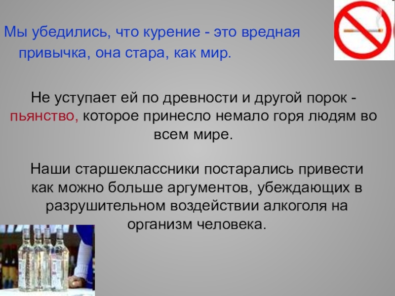 Наши старшеклассники постарались привести как можно больше аргументов, убеждающих в разрушительном воздействии алкоголя на организм человека.
