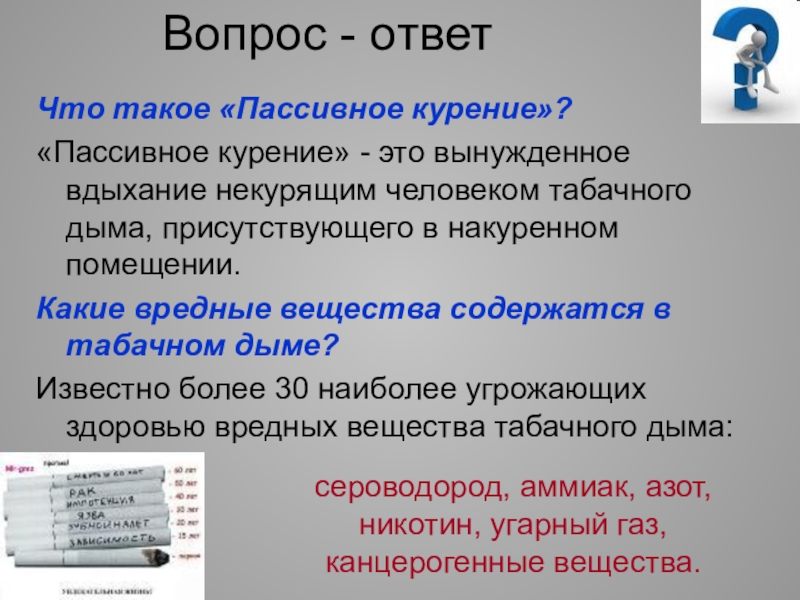 сероводород, аммиак, азот, никотин, угарный газ, канцерогенные вещества.