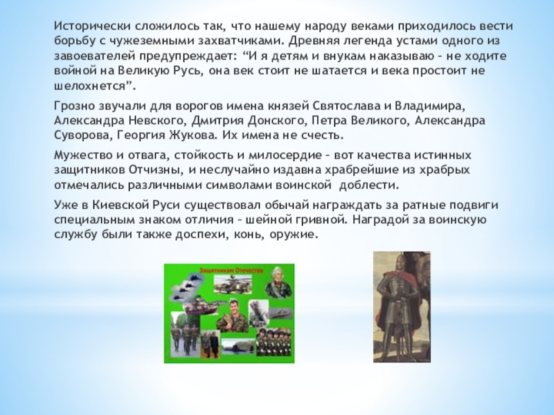 Слайд 6Исторически сложилось так, что нашему народу веками приходилось вести борьбу с