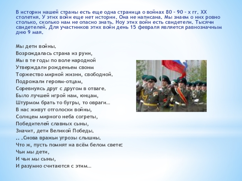 – 90 – х гг. ХХ столетия. У этих войн еще нет истории. Она не написана. Мы знаем о них ровно столько, сколько нам не опасно знать. Ноу этих войн есть свидетели. Тысячи свидетелей. Для участников этих войн день 15 февраля является равнозначным дню 9 мая.