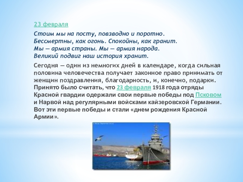 Сегодня — один из немногих дней в календаре, когда сильная половина человечества получает законное право принимать от женщин поздравления, благодарность, и, конечно, подарки. Принято было считать, что 23 февраля 1918 года отряды Красной гвардии одержали свои первые победы под Псковом и Нарвой над регулярными войсками кайзеровской Германии. Вот эти первые победы и стали «днем рождения Красной Армии».