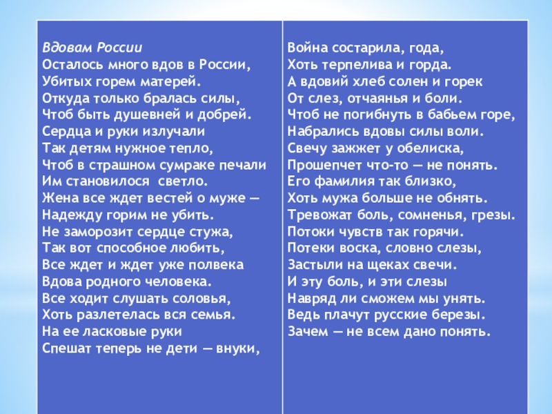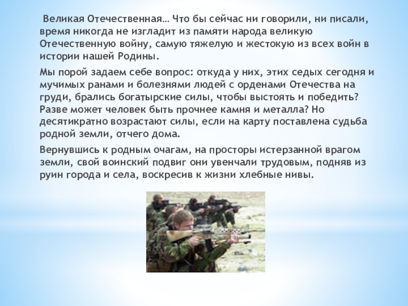 никогда не изгладит из памяти народа великую Отечественную войну, самую тяжелую и жестокую из всех войн в истории нашей Родины.