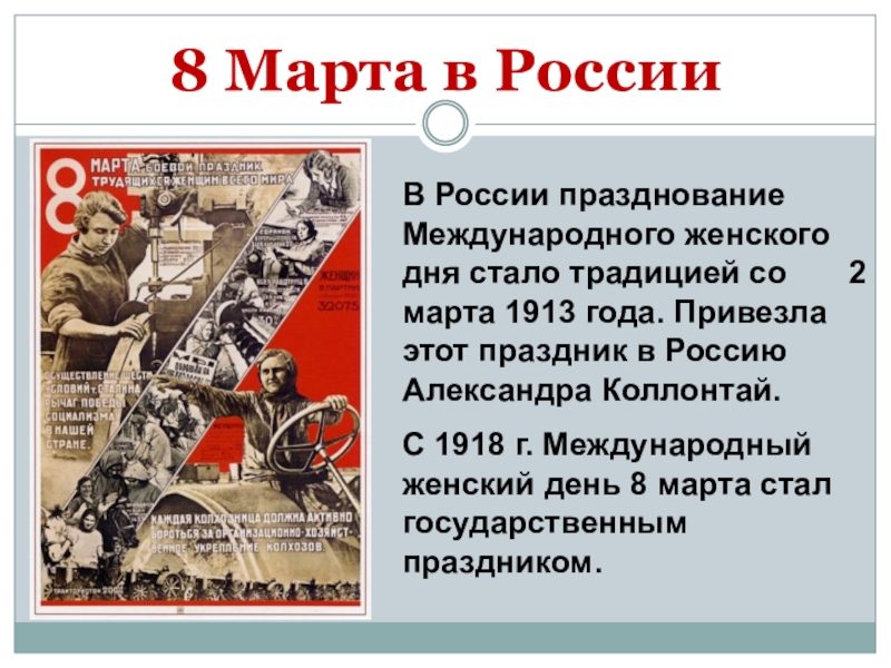 С 1918 г. Международный женский день 8 марта стал государственным праздником.