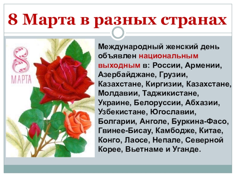 рабочим в таких странах, как Германия, Франция, Италия, Дания, Австрия, Польша, Румыния, Литва и др. В Сирии 8 марта отмечают День Революции, а в Либерии - как День памяти павших.