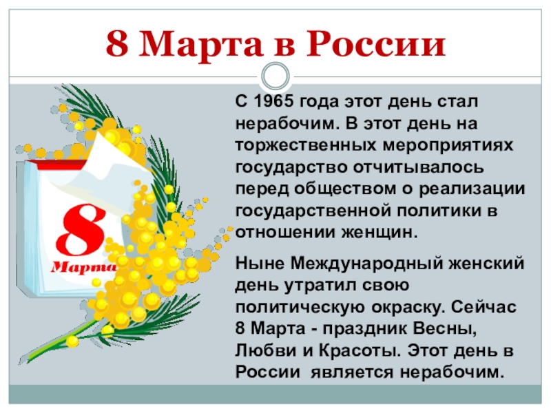 Ныне Международный женский день утратил свою политическую окраску. Сейчас 8 Марта - праздник Весны, Любви и Красоты. Этот день в России является нерабочим.