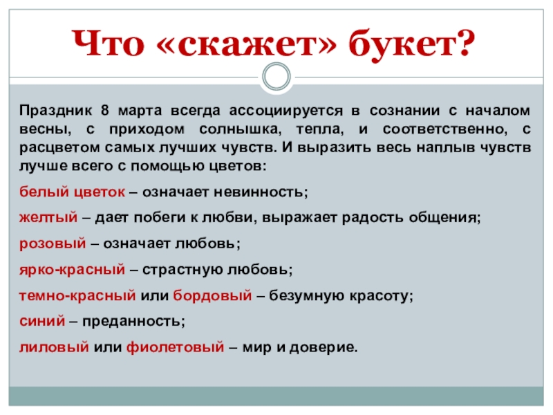 весны, с приходом солнышка, тепла, и соответственно, с расцветом самых лучших чувств. И выразить весь наплыв чувств лучше всего с помощью цветов: