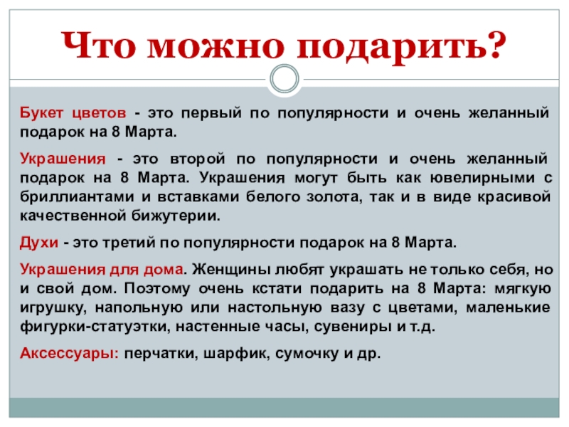 Украшения для дома. Женщины любят украшать не только себя, но и свой дом. Поэтому очень кстати подарить на 8 Марта: мягкую игрушку, напольную или настольную вазу с цветами, маленькие фигурки-статуэтки, настенные часы, сувениры и т.д.