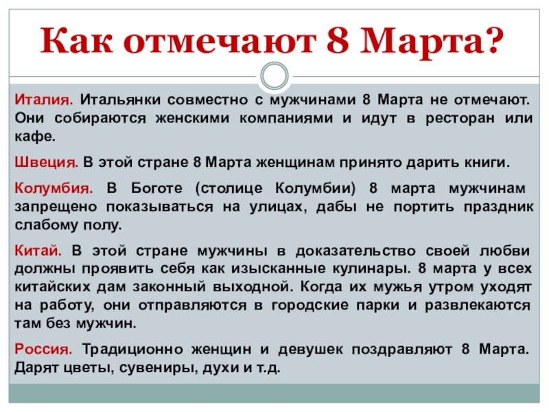 Колумбия. В Боготе (столице Колумбии) 8 марта мужчинам запрещено показываться на улицах, дабы не портить праздник слабому полу.