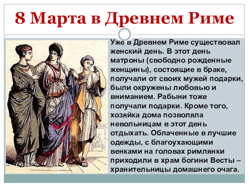 В этот день матроны (свободно рожденные женщины), состоящие в браке, получали от своих мужей подарки, были окружены любовью и вниманием. Рабыни тоже получали подарки. Кроме того, хозяйка дома позволяла невольницам в этот день отдыхать. Облаченные в лучшие одежды, с благоухающими венками на головах римлянки приходили в храм богини Весты – хранительницы домашнего очага.
