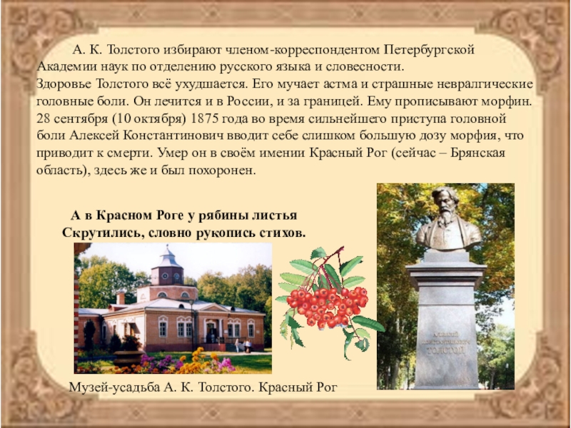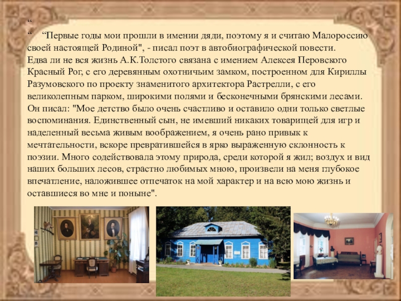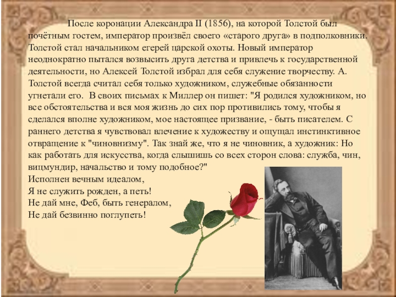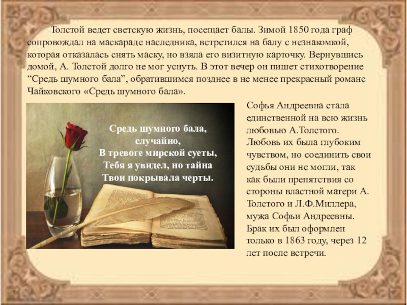 Софья Андреевна стала единственной на всю жизнь любовью А.Толстого. Любовь их была глубоким чувством, но соединить свои судьбы они не могли, так как были препятствия со стороны властной матери А.Толстого и Л.Ф.Миллера, мужа Софьи Андреевны. Брак их был оформлен только в 1863 году, через 12 лет после встречи.