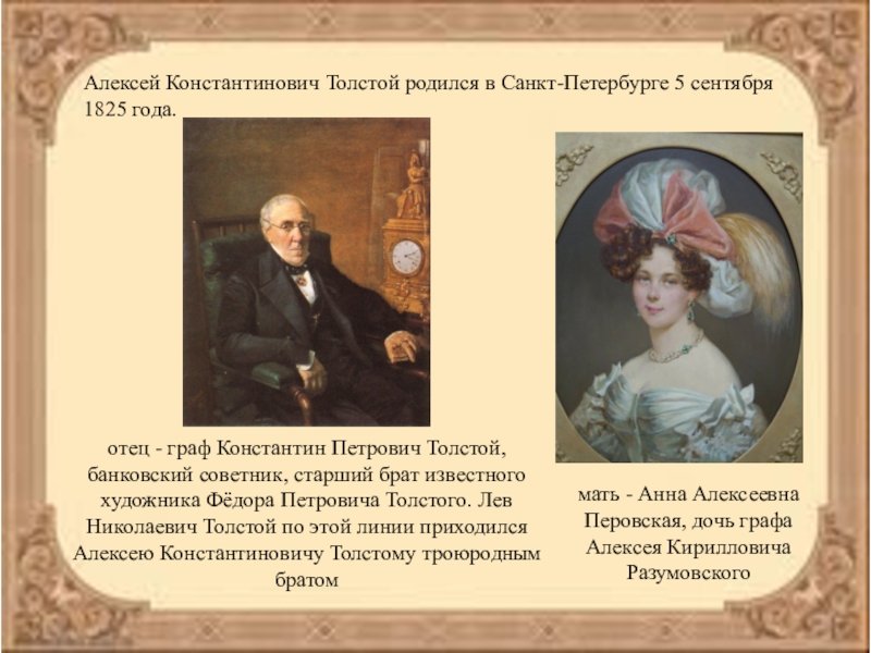 отец - граф Константин Петрович Толстой, банковский советник, старший брат известного художника Фёдора Петровича Толстого. Лев Николаевич Толстой по этой линии приходился Алексею Константиновичу Толстому троюродным братом