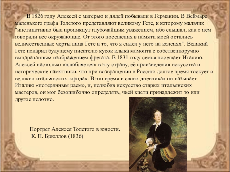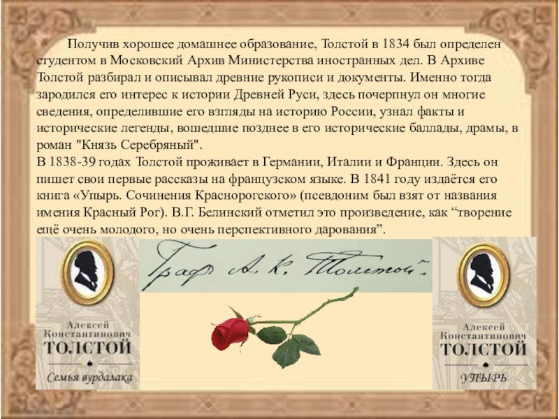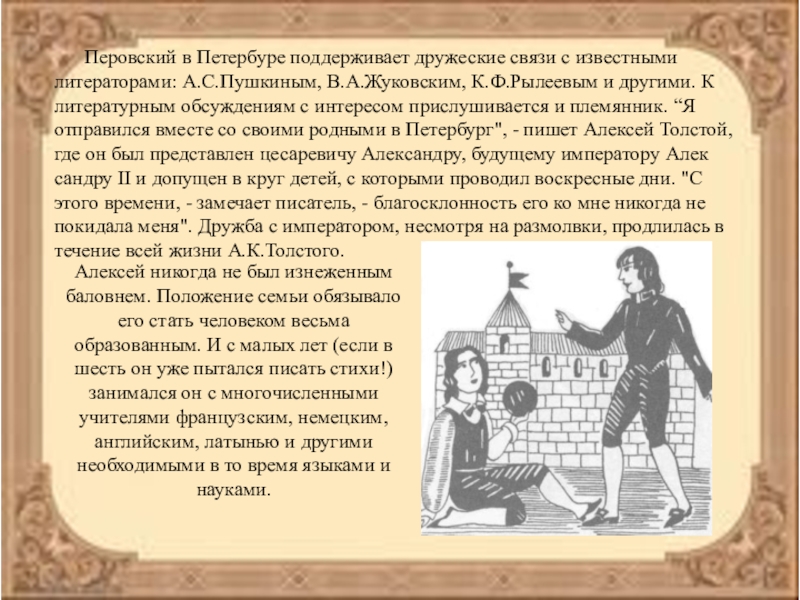 Алексей никогда не был изнеженным баловнем. Положение семьи обязывало его стать человеком весьма образованным. И с малых лет (если в шесть он уже пытался писать стихи!) занимался он с многочисленными учителями французским, немецким, английским, латынью и другими необходимыми в то время языками и науками.