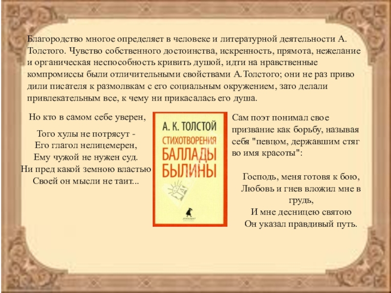 Сам поэт понимал свое призвание как борьбу, называя себя "певцом, державшим стяг во имя красоты":