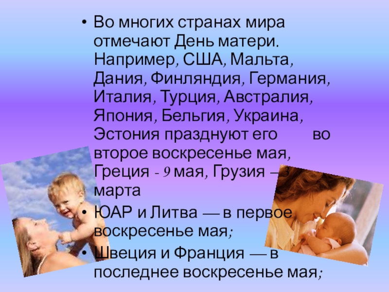 Слайд 13Во многих странах мира отмечают День матери. Например, США, Мальта, Дания,