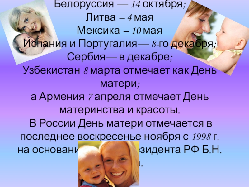 В России День матери отмечается в последнее воскресенье ноября с 1998 г. на основании Указа Президента РФ Б.Н. Ельцина.