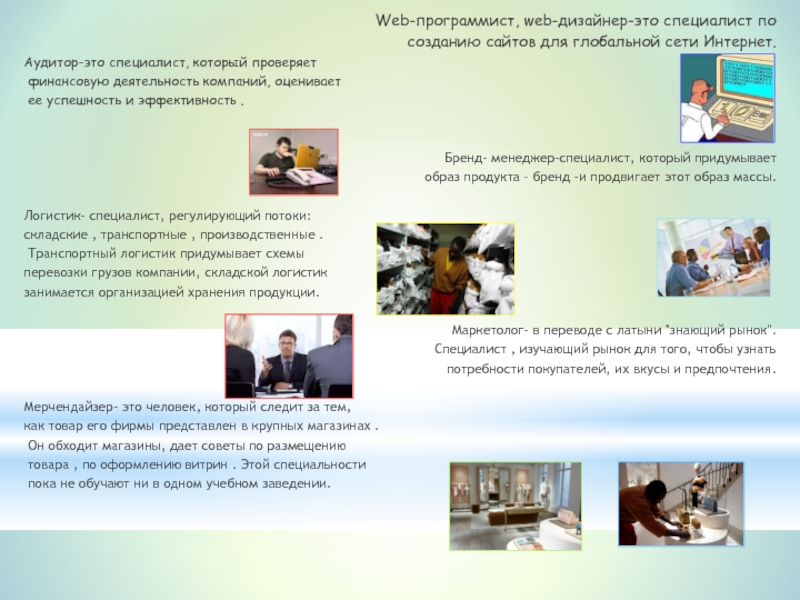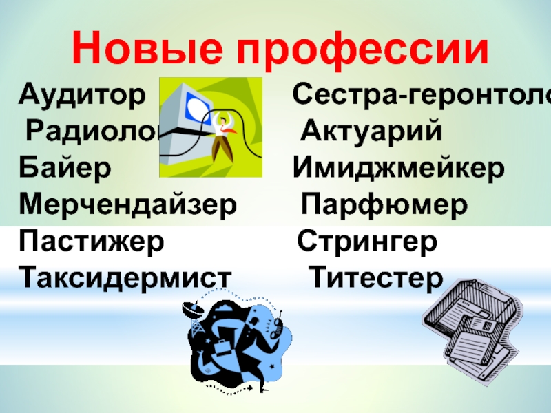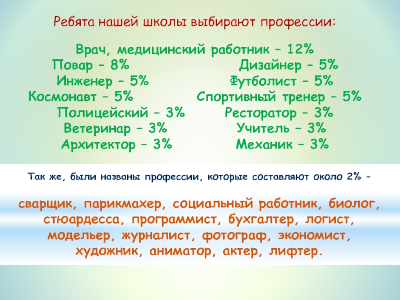 сварщик, парикмахер, социальный работник, биолог, стюардесса, программист, бухгалтер, логист, модельер, журналист, фотограф, экономист, художник, аниматор, актер, лифтер.