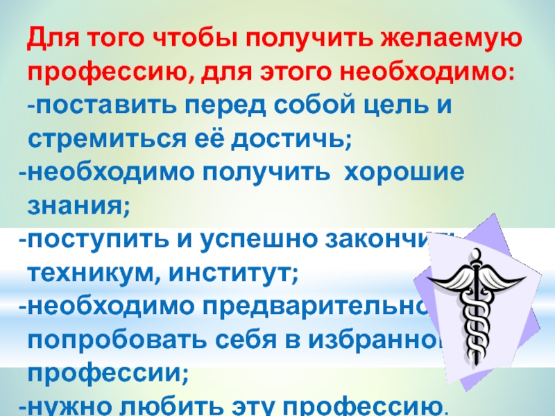 Слайд 24Для того чтобы получить желаемую профессию, для этого необходимо: