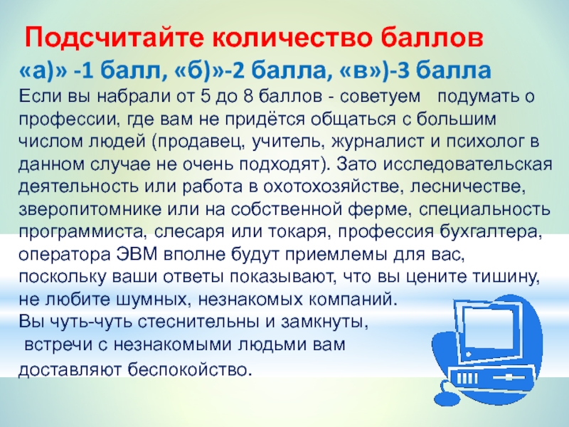 Если вы набрали от 5 до 8 баллов - советуем подумать о профессии, где вам не придётся общаться с большим числом людей (продавец, учитель, журналист и психолог в данном случае не очень подходят). Зато исследовательская деятельность или работа в охотохозяйстве, лесничестве, зверопитомнике или на собственной ферме, специальность программиста, слесаря или токаря, профессия бухгалтера, оператора ЭВМ вполне будут приемлемы для вас, поскольку ваши ответы показывают, что вы цените тишину, не любите шумных, незнакомых компаний.