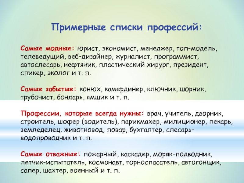 Профессии, которые всегда нужны: врач, учитель, дворник, строитель, шофер (водитель), парикмахер, милиционер, пекарь, земледелец, животновод, повар, бухгалтер, слесарь-водопроводчик и т. п.