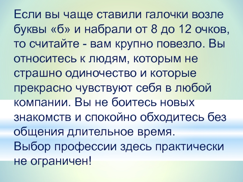 Слайд 22Если вы чаще ставили галочки возле буквы «б» и набрали от