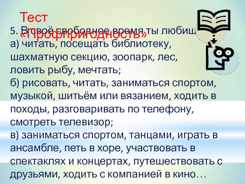 в) заниматься спортом, танцами, играть в ансамбле, петь в хоре, участвовать в спектаклях и концертах, путешествовать с друзьями, ходить с компанией в кино…