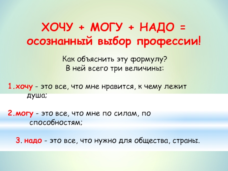 Слайд 14ХОЧУ + МОГУ + НАДО = осознанный выбор профессии!
