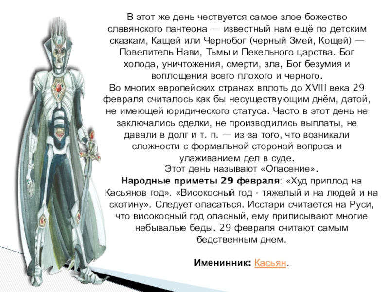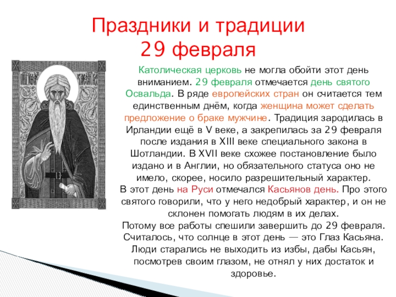 Народные приметы 29 февраля: «Худ приплод на Касьянов год». «Високосный год - тяжелый и на людей и на скотину». Следует опасаться. Исстари считается на Руси, что високосный год опасный, ему приписывают многие небывалые беды. 29 февраля считают самым бедственным днем.