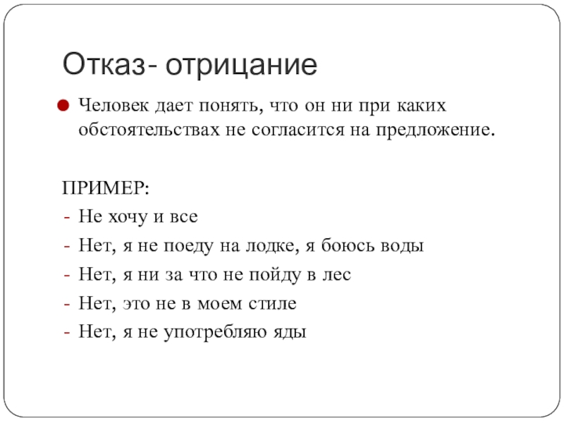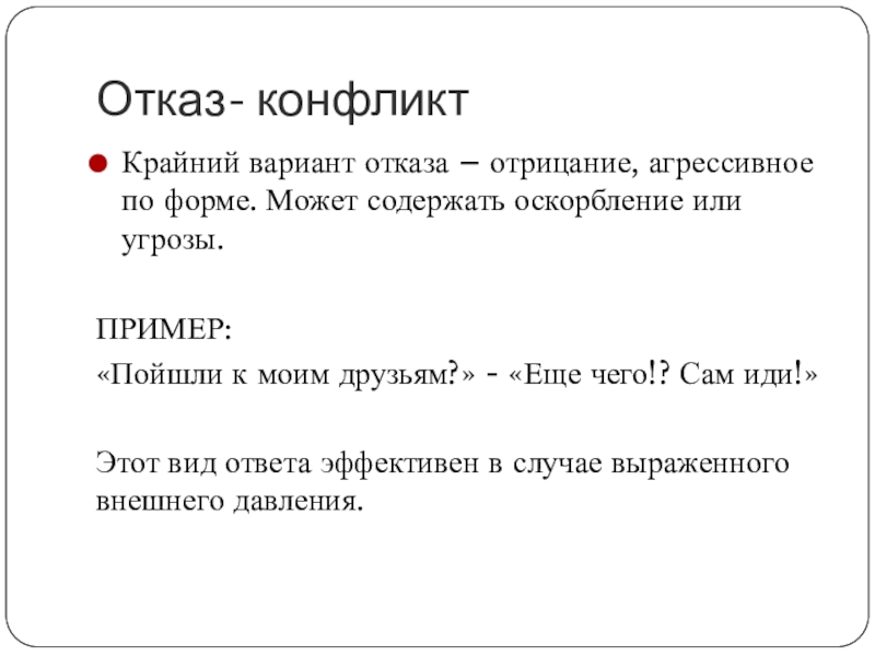 Крайний вариант отказа – отрицание, агрессивное по форме. Может содержать