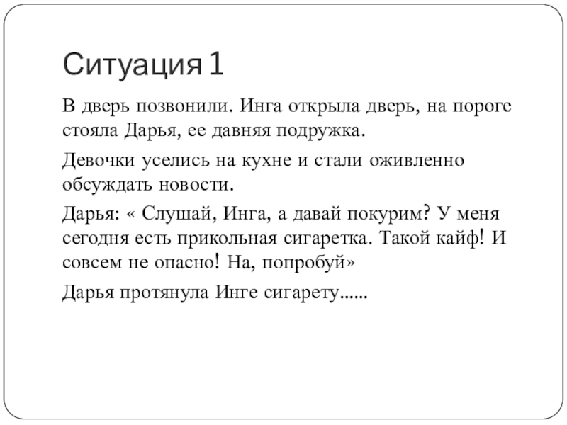 Дарья: « Слушай, Инга, а давай покурим? У меня сегодня есть прикольная сигаретка. Такой кайф! И совсем не опасно! На, попробуй»