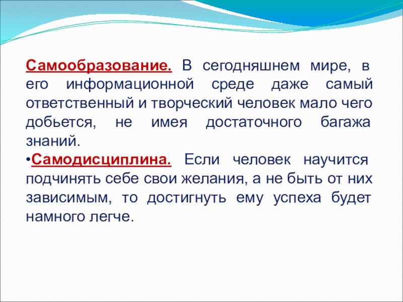 Слайд 10Самообразование. В сегодняшнем мире, в его информационной среде даже самый ответственный