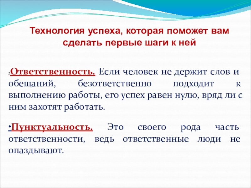 •Пунктуальность. Это своего рода часть ответственности, ведь ответственные люди не опаздывают.