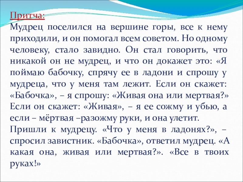 он помогал всем советом. Но одному человеку, стало завидно. Он стал говорить, что никакой он не мудрец, и что он докажет это: «Я поймаю бабочку, спрячу ее в ладони и спрошу у мудреца, что у меня там лежит. Если он скажет: «Бабочка», – я спрошу: «Живая она или мертвая?» Если он скажет: «Живая», – я ее сожму и убью, а если – мёртвая –разожму руки, и она улетит.