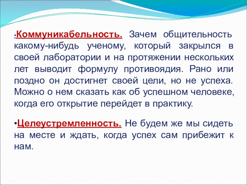 Слайд 9•Коммуникабельность. Зачем общительность какому-нибудь ученому, который закрылся в своей лаборатории и