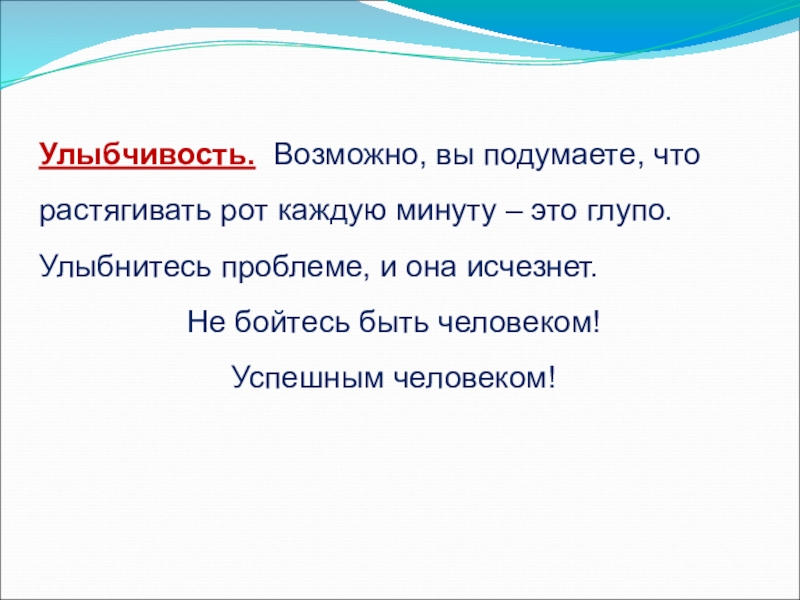 Слайд 11Улыбчивость. Возможно, вы подумаете, что растягивать рот каждую минуту – это