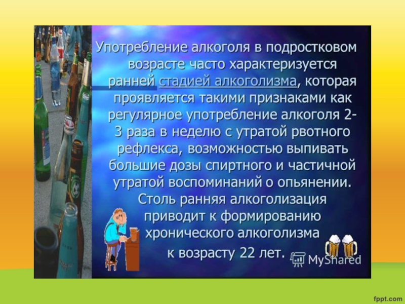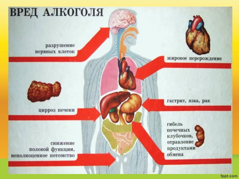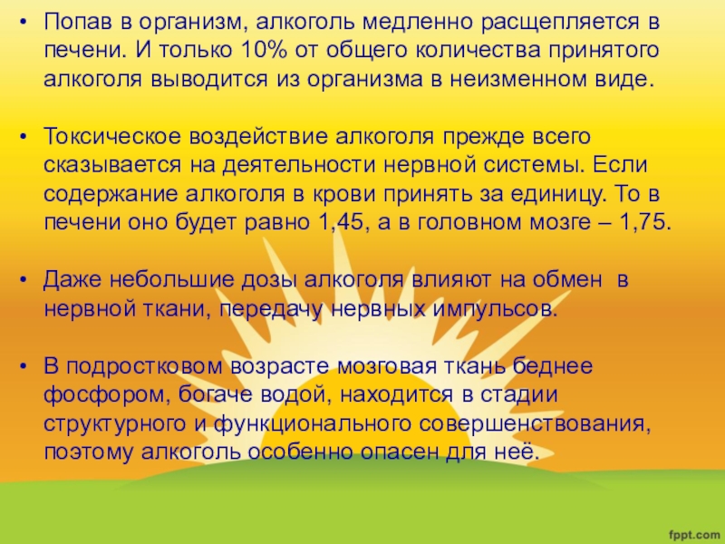 Слайд 28Попав в организм, алкоголь медленно расщепляется в печени. И только 10%