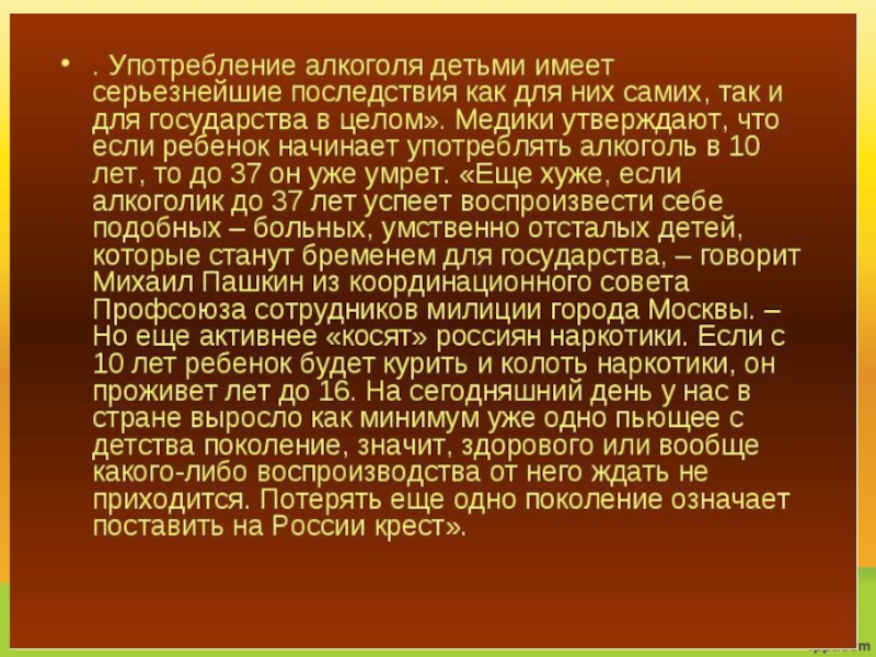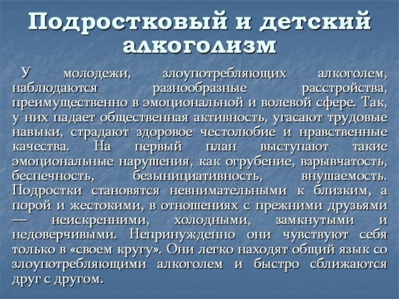 В подростковом возрасте мозговая ткань беднее фосфором, богаче водой, находится в стадии структурного и функционального совершенствования, поэтому алкоголь особенно опасен для неё.
