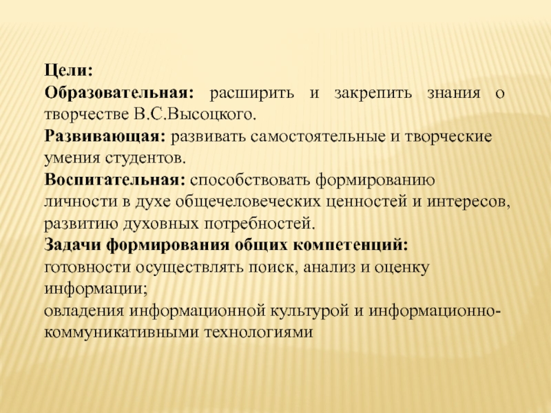 Образовательная: расширить и закрепить знания о творчестве В.С.Высоцкого.