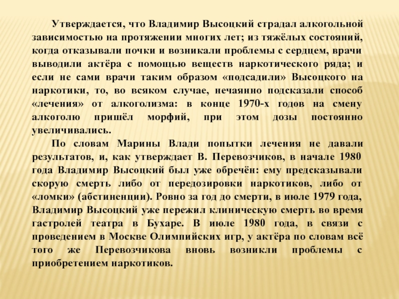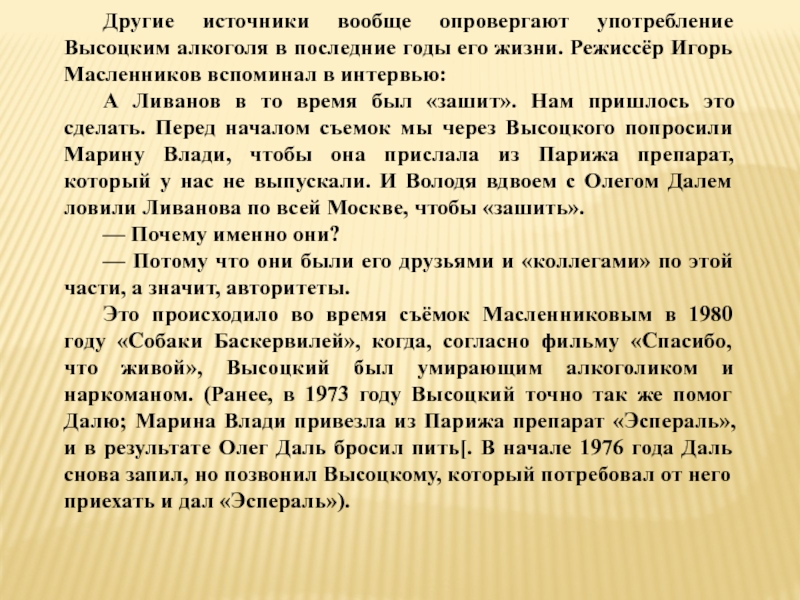 Слайд 21Другие источники вообще опровергают употребление Высоцким алкоголя в последние годы его