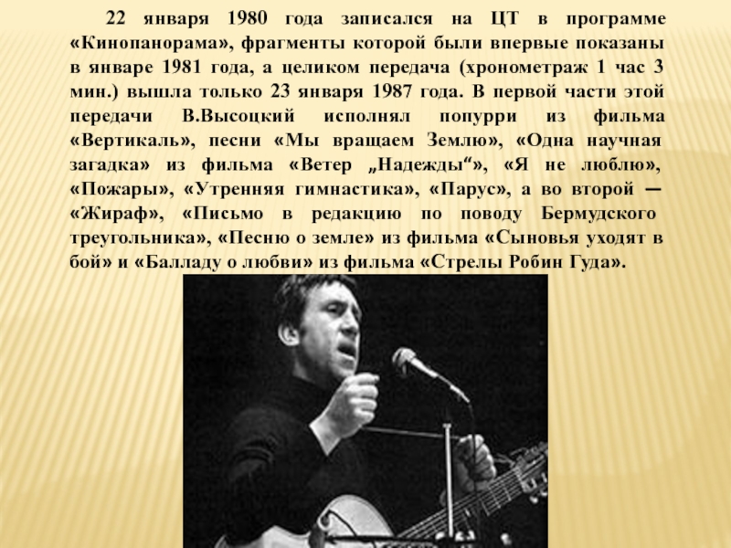 Слайд 1822 января 1980 года записался на ЦТ в программе «Кинопанорама», фрагменты