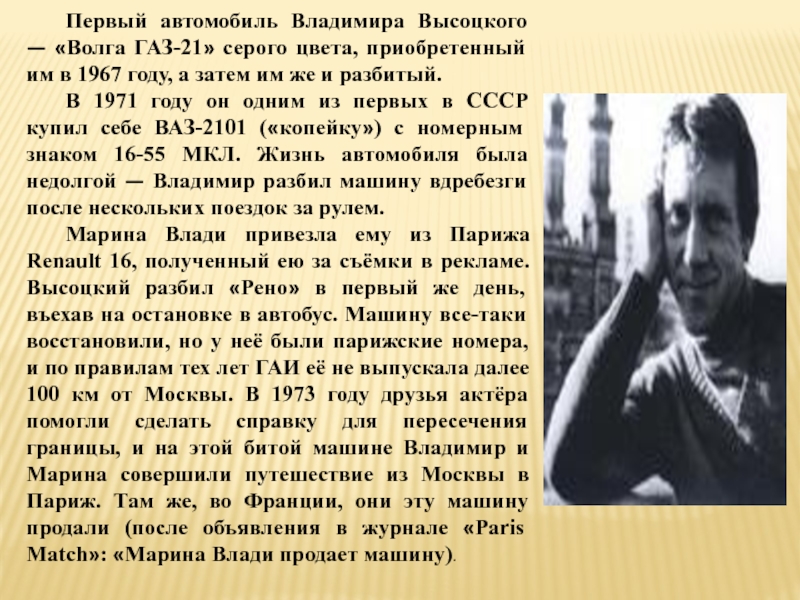 Слайд 42Первый автомобиль Владимира Высоцкого — «Волга ГАЗ-21» серого цвета, приобретенный им