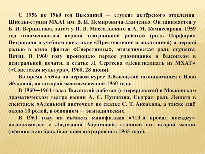 Слайд 12С 1956 по 1960 год Высоцкий — студент актёрского отделения Школы-студии