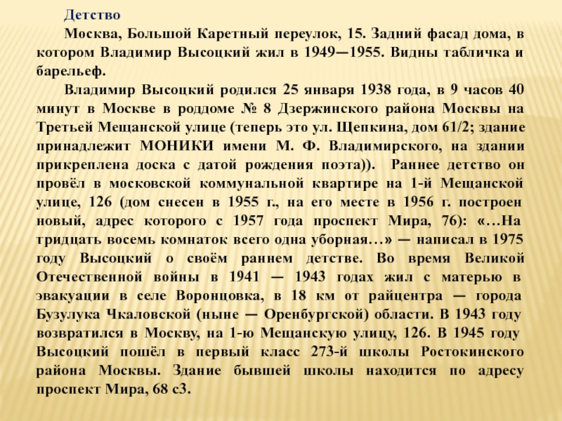 Владимир Высоцкий родился 25 января 1938 года, в 9 часов 40 минут в Москве в роддоме № 8 Дзержинского района Москвы на Третьей Мещанской улице (теперь это ул. Щепкина, дом 61/2; здание принадлежит МОНИКИ имени М. Ф. Владимирского, на здании прикреплена доска с датой рождения поэта)). Раннее детство он провёл в московской коммунальной квартире на 1-й Мещанской улице, 126 (дом снесен в 1955 г., на его месте в 1956 г. построен новый, адрес которого с 1957 года проспект Мира, 76): «…На тридцать восемь комнаток всего одна уборная…» — написал в 1975 году Высоцкий о своём раннем детстве. Во время Великой Отечественной войны в 1941 — 1943 годах жил с матерью в эвакуации в селе Воронцовка, в 18 км от райцентра — города Бузулука Чкаловской (ныне — Оренбургской) области. В 1943 году возвратился в Москву, на 1-ю Мещанскую улицу, 126. В 1945 году Высоцкий пошёл в первый класс 273-й школы Ростокинского района Москвы. Здание бывшей школы находится по адресу проспект Мира, 68 с3.