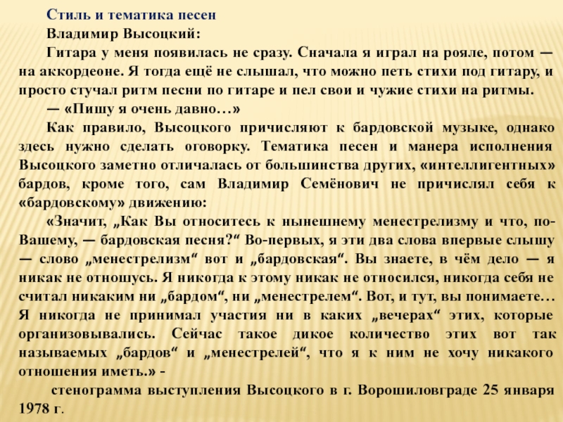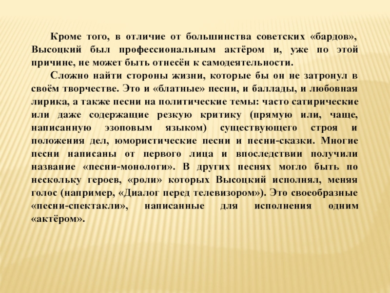 Кроме того, в отличие от большинства советских «бардов», Высоцкий был профессиональным